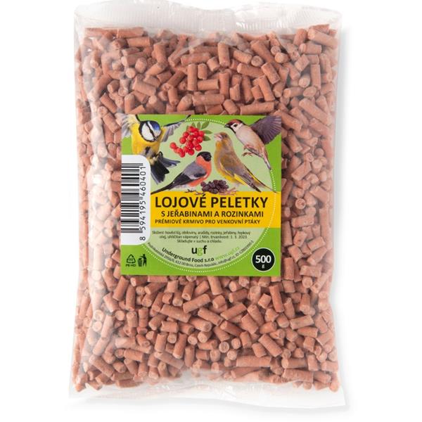Lojové peletky s jeřabinami a rozinkami jsou prémiové krmivo pro venkovní ptáky. Obsahují kvalitní hovězí lůj, obiloviny, arašídy, jeřabiny a rozinky. Pro ptáky jsou velmi atraktivní a přilákají do zahrady různé druhy divokých ptáků. Mohou se podávat samostatně v krmítcích nebo na zemi. Skvěle také doplňují různé semínkové směsi.