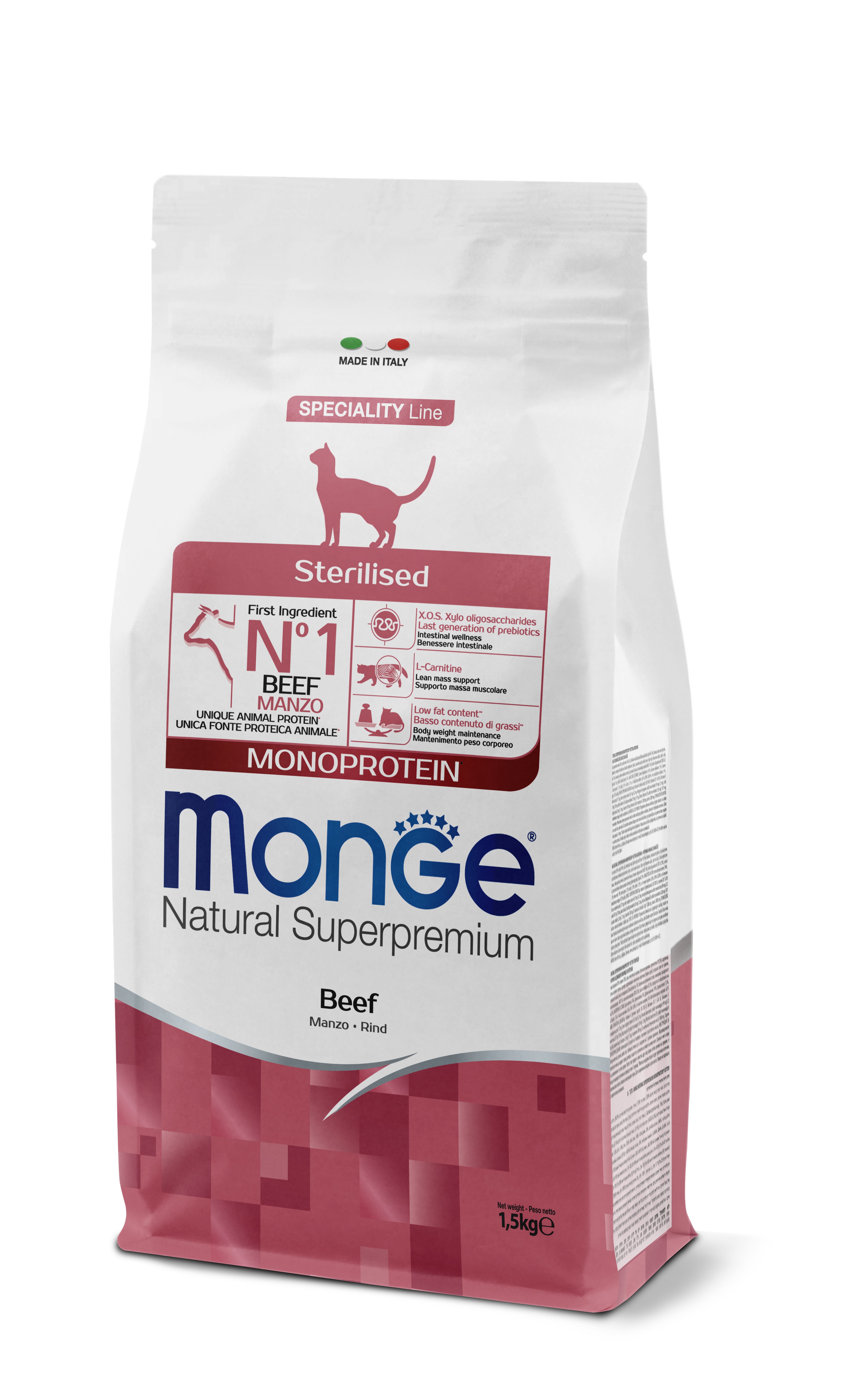 Monge Natural Superpremium Monoprotein* Sterilized Cat Beef je kompletní a vyvážené krmivo pro dospělé kočky. Vytvořeno pro pohodu vaší sterilizované kočky díky nízkému obsahu tuku** pro udržení ideální tělesné hmotnosti a L-karnitinu pro podporu netukové hmoty. Složení s unikátním zdrojem živočišných bílkovin (hovězí maso), obohacené o xylooligosacharidy (XOS), prebiotika pro podporu střevní kondice. Zahrnutí vybraných ingrediencí, jako je šípek s antioxidačními sloučeninami pro neutralizaci volných radikálů, a yucca schidigera pro omezení střevních pachů, je výsledkem výzkumu Made in Italy zaměřeného na podporu kvality života naší kočky. Bez přidaných barviv a umělých konzervačních látek.