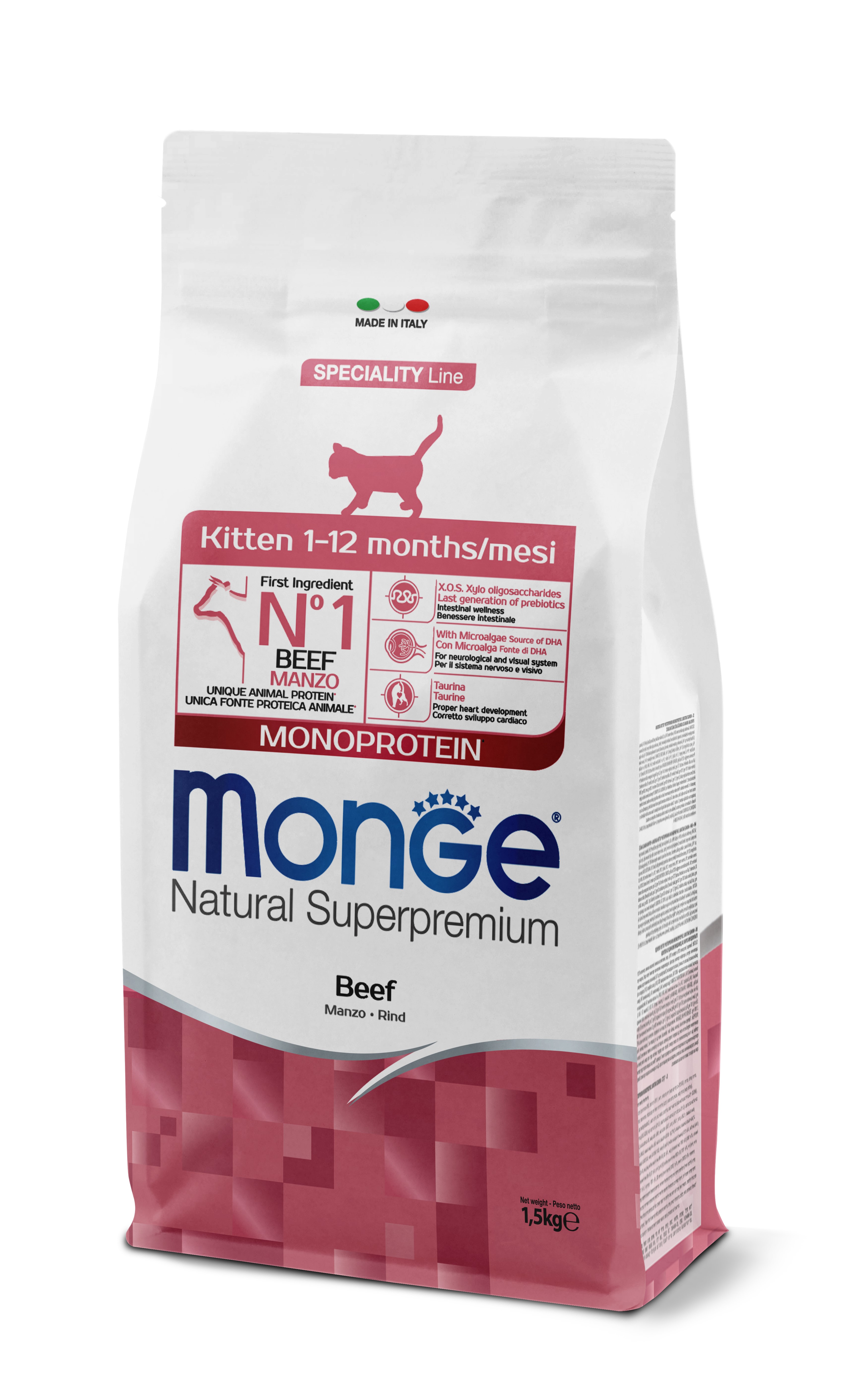 Monge Natural Superpremium Monoprotein* Kitten Beef je kompletní a vyvážené krmivo pro koťata. Speciálně vyvinuto pro pohodu vašeho kotěte díky oleji z mikrořas (Schizochytrium sp.), přírodnímu zdroji DHA pro rozvoj neurologického a zrakového systému a taurinu pro správný vývoj srdce. Produkt vyrobený z jediného zdroje živočišných bílkovin*, první složkou je hovězí maso a vyznačuje se stravitelností a chutností díky zahrnutí čerstvého masa. Formulace je obohacena o XOS (xylo-oligosacharidy), prebiotika nové generace pro podporu střevního zdraví. Zahrnutí vybraných ingrediencí, jako je šípek s antioxidačními sloučeninami pro neutralizaci volných radikálů, a yucca schidigera pro omezení střevních pachů, je výsledkem výzkumu Made in Italy na podporu kvality života vašeho kotěte. Bez přidaných barviv a umělých konzervačních látek.