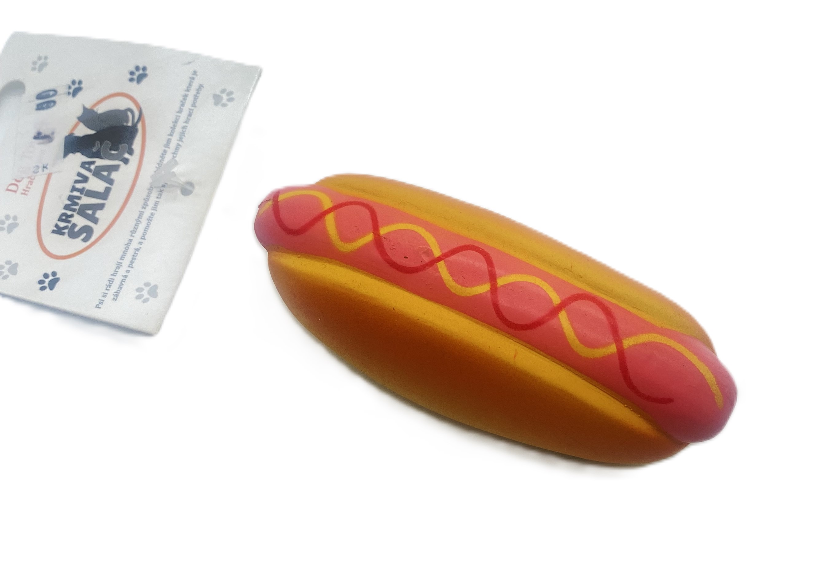 Latexová hračka pro malé psy ve tvaru hot dogu.