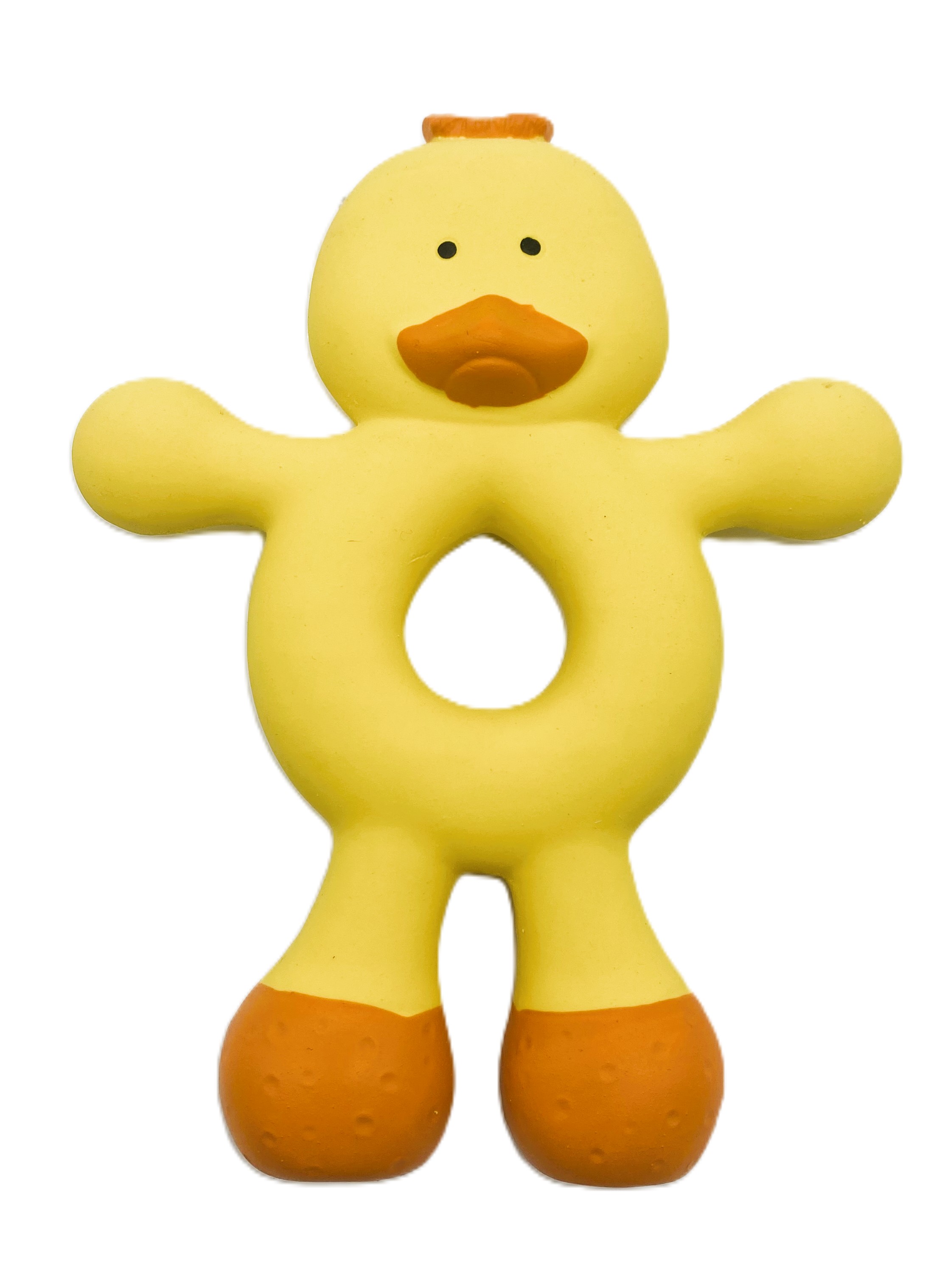 Latexová hračka pro psy ve tvaru kuřátka s dírou v pupíku.