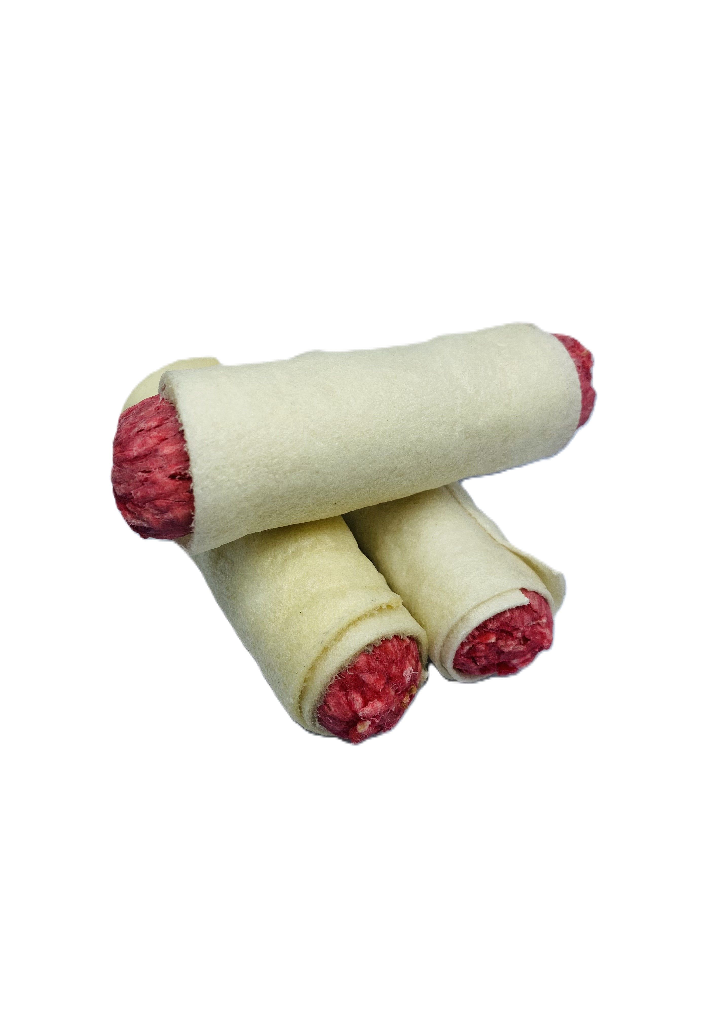 Chutný pamlsek ve tvaru párku v rohlíku. Vnitřek je tvořený s drcené barvené buvolí kůže a je obalený plátem lisované buvolí kůže.