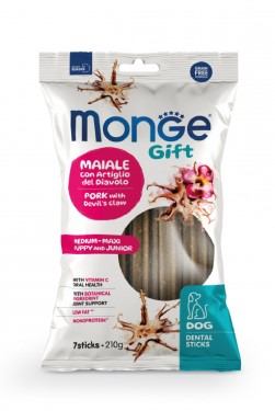 MONGE GIFT Dog Dentální jemné tyčinky PUPPY MEDIUM/MAXI vepřové/ďáblův dráp (harpagofyt) 210g