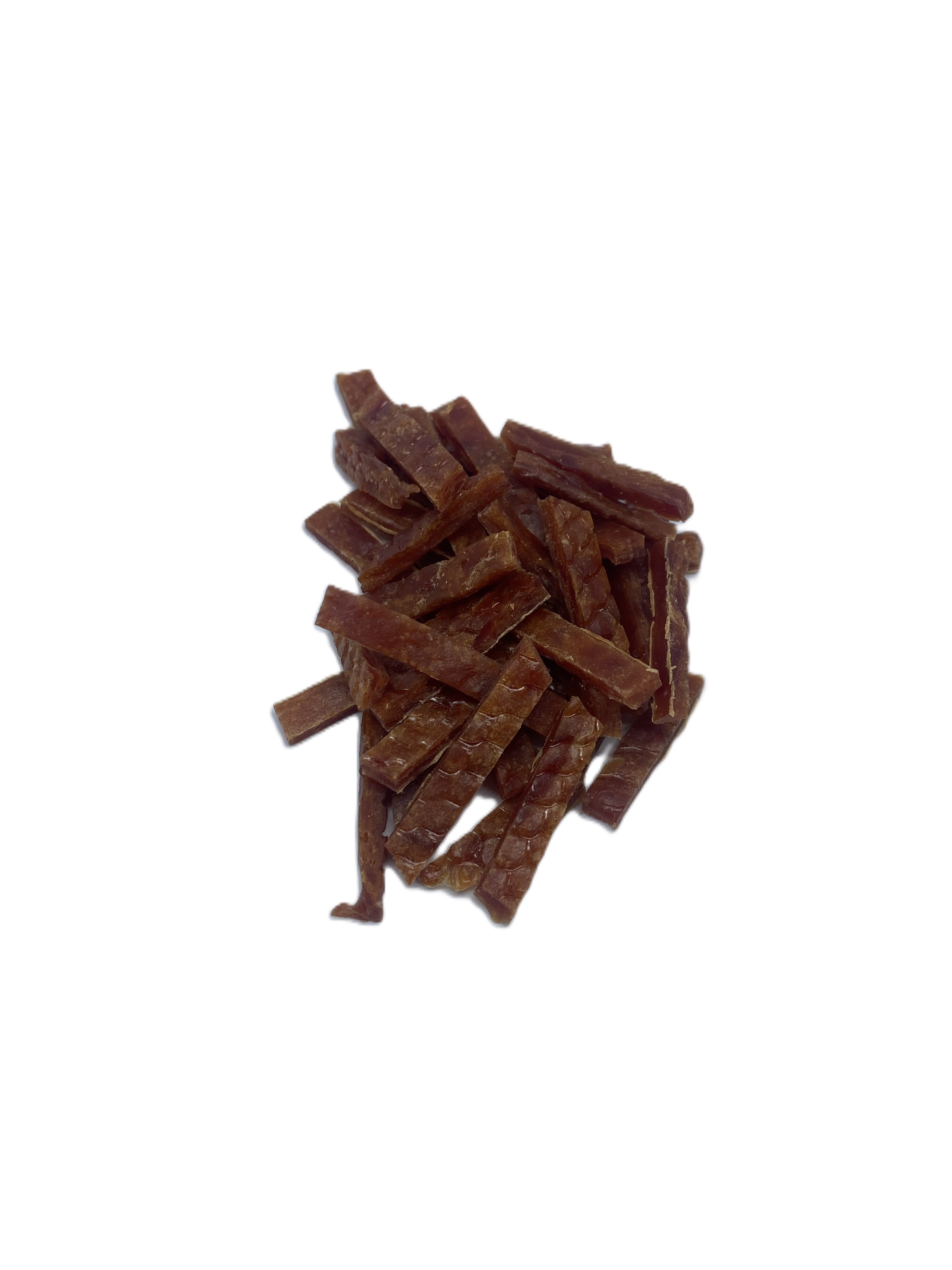 Sekané kachní masíčko na malé krátké proužky. Je měkké, voňavé a pejskům i kočičkám moc chutná.