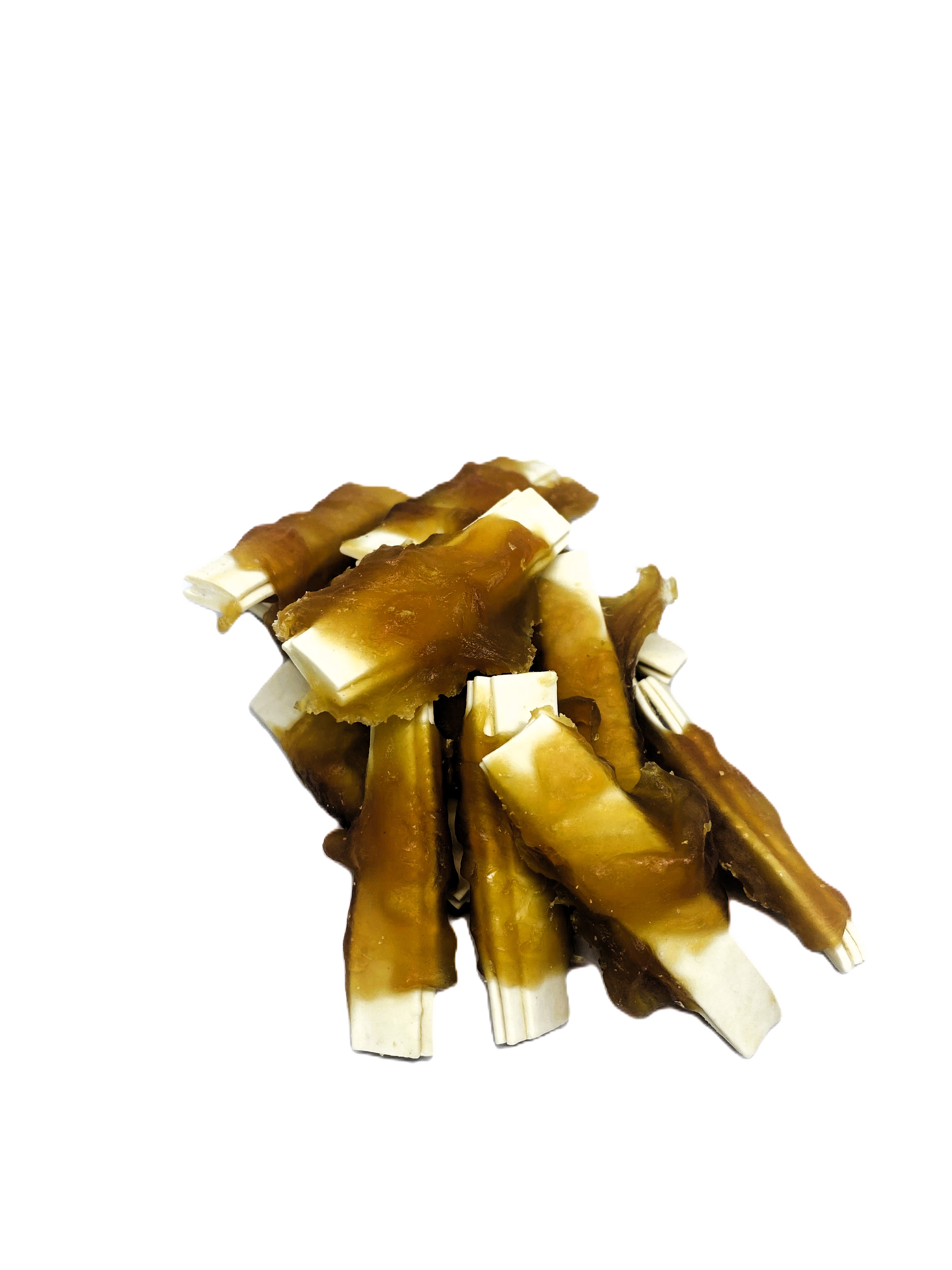 Nabízíme oblíbené proužky z tresky, které jsou obalené tenkými plátky kuřecího masa. Velikost pamlsku je cca 5cm.