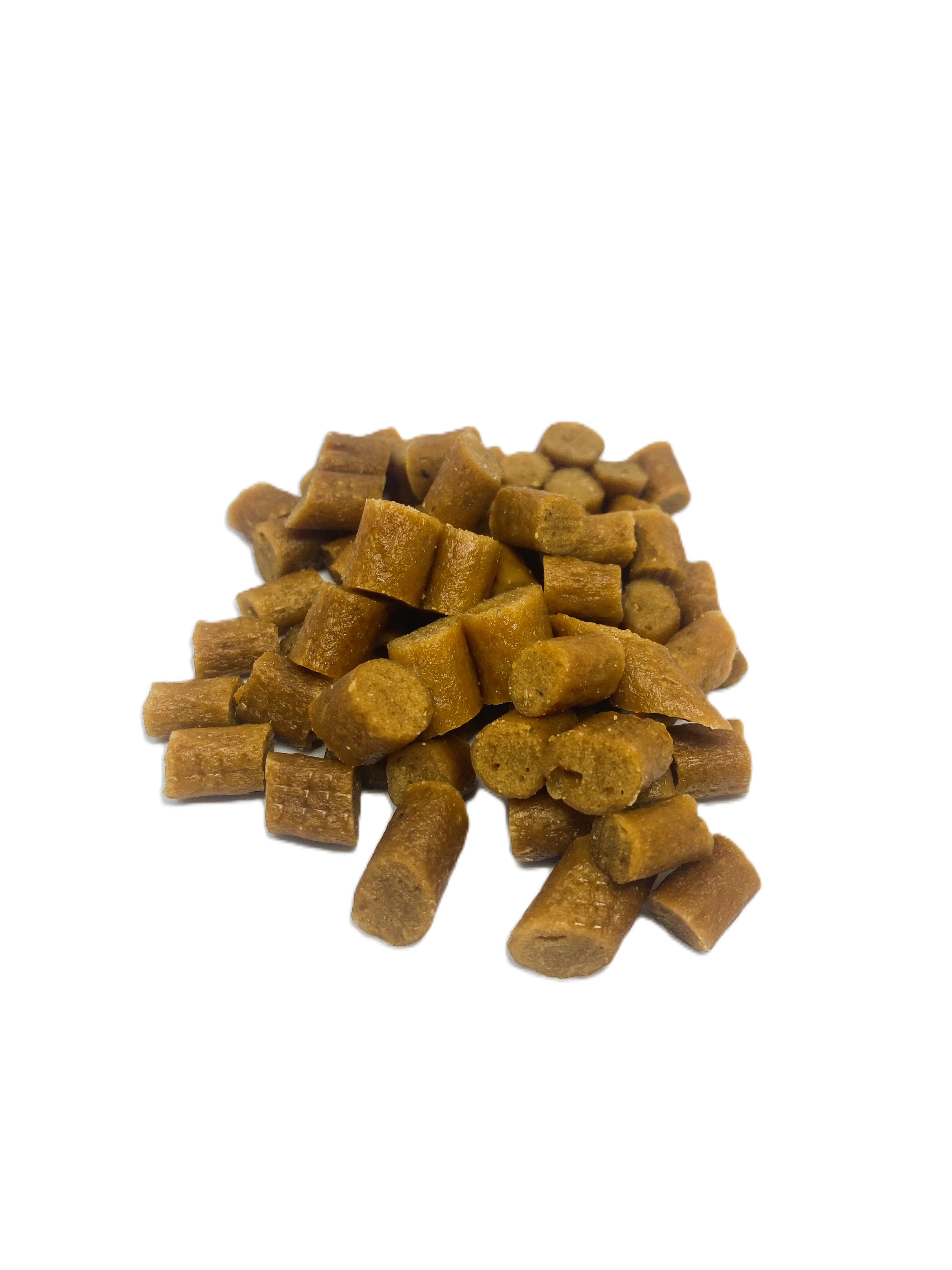 Tyčinka kuřecí s lososem sekaná na malé kousky je vhodná pro pejsky i kočky jako odměna.