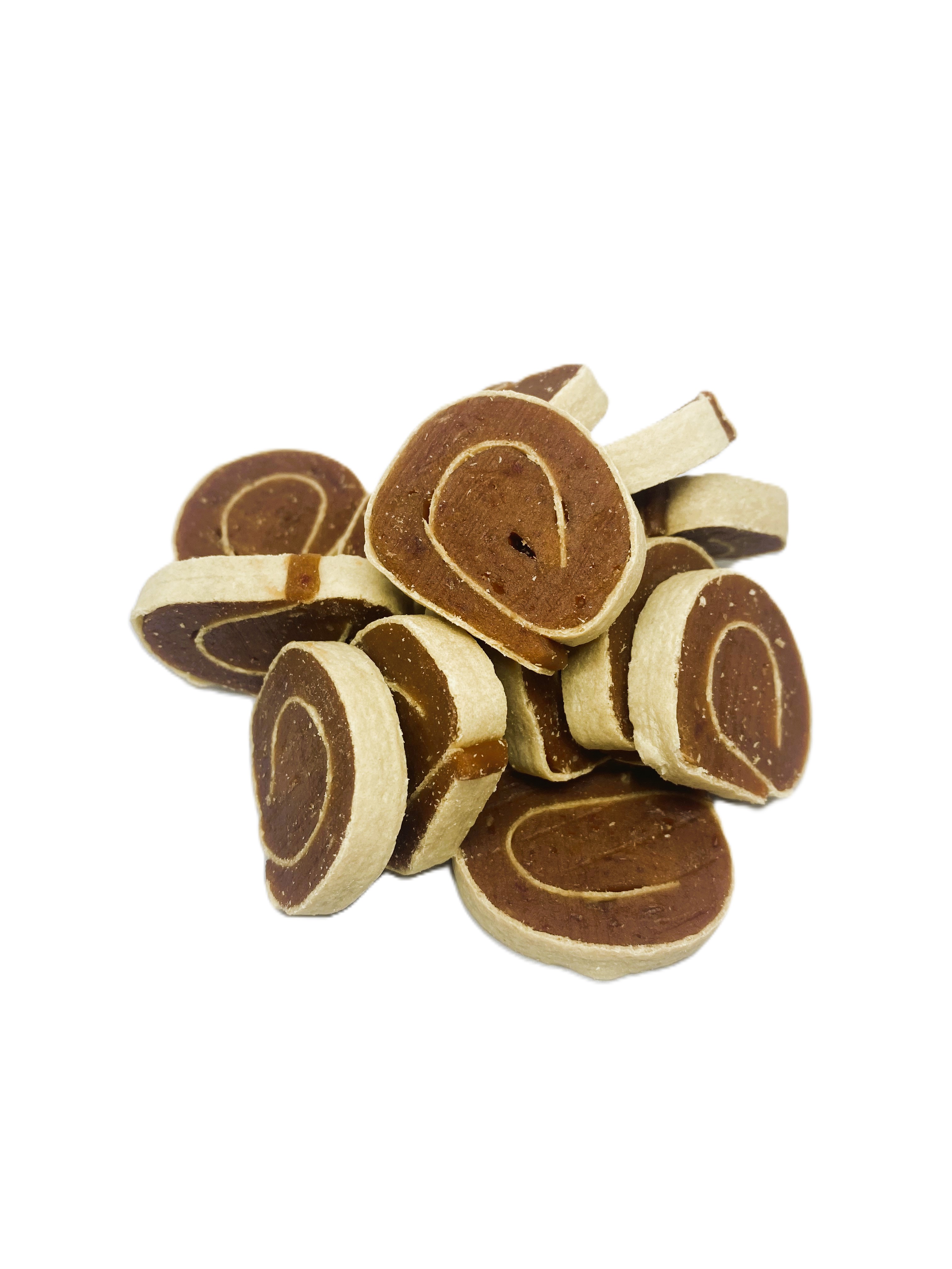 Měkoučkatý pamlsek z jehněčího masa a tresky je chutný, snadno se láme a je vhodný pro malé i velké pejsky. Velikost závitku je cca 3-4cm.